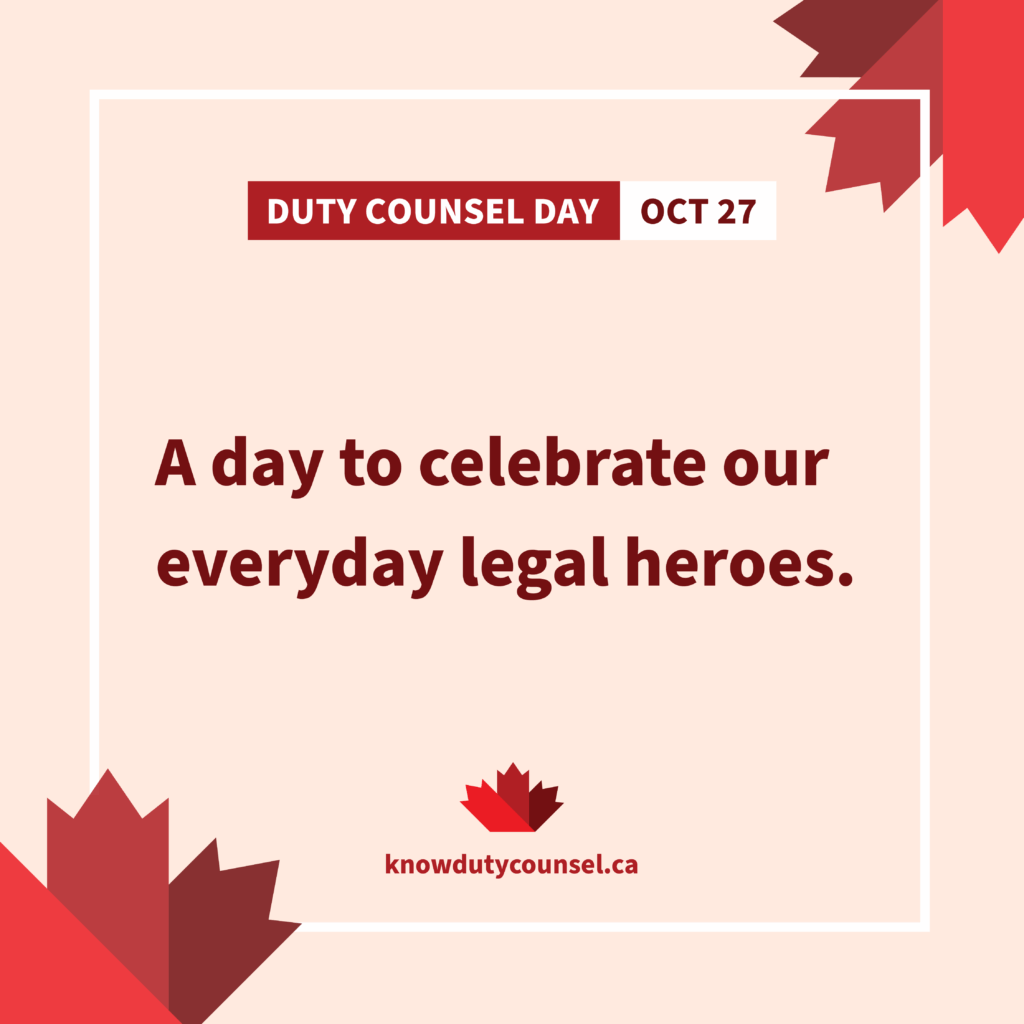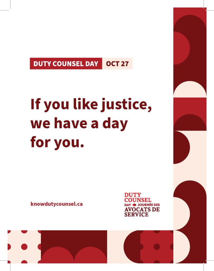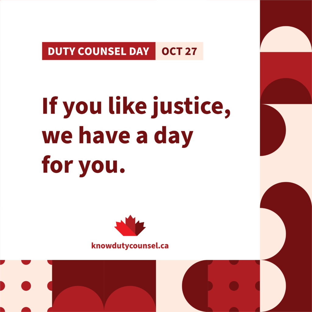 “If you like justice, I have a day for you. It’s important we know our Charter rights and how to exercise them. On Oct 27, I’m standing with Duty Counsel—legal aid lawyers who defend our rights. You can too. knowdutycounsel.ca #knowdutycounsel #dutycounselday #accesstojustice”