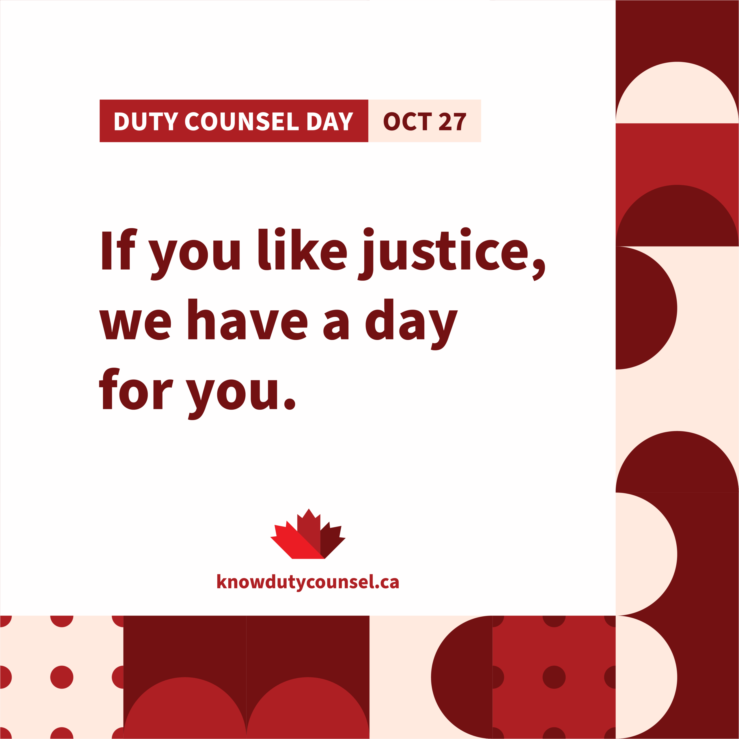 “I believe every Canadian deserves help navigating the justice system. Do you? Show your support for legal aid Duty Counsel. knowdutycounsel.ca #knowdutycounsel #dutycounselday”